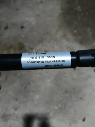 Resorte de gas con especificaciones claras. - Modelo: 18-8-410 - Fuerza: 350N - Advertencia: NO ABRIR ALTA PRESIÓN - Fecha de fabricación: 2026-01 20€ unidad hay 4