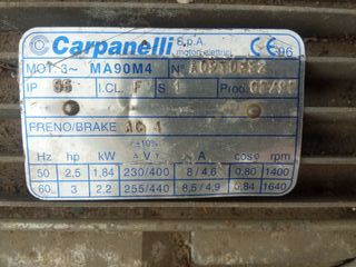 Motor eléctrico trifásico industrial Carpanelli, modelo MA90M4, con freno electromagnético AC incorporado. Características: - Potencia: 2,5 CV (1,84 kW) - Velocidad: 1400 rpm - Tensión: 230/400 V (trifásico) - Frecuencia: 50 Hz - Protección: IP55 - Servicio: S1 (continuo) - Con freno eléctrico AC 4 Posibilidad de entrega en mano en Huesca.