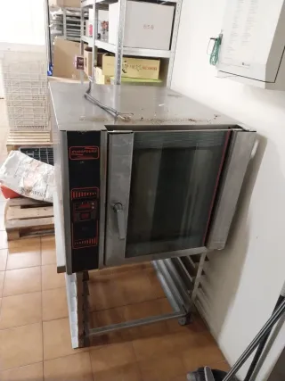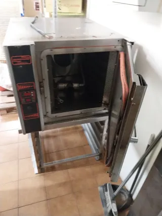 Horno de convección profesional con capacidad para 5 bandejas de tamaño 60x40 cm. Lo he cambiado por uno nuevo, funciona bien, pero hay que cambiar la bandeja de arriba por la de abajo a mitad de cocción y la goma de la puerta está desgastada, habría que sustituirla. - Marca: EUROFOURS - Ideal para panaderías, pastelerías y restaurantes. - Construcción robusta en acero inoxidable.