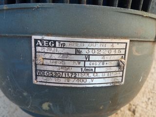 Motor eléctrico industrial trifásico AEG. Caraterísticas: - Motor trifásico AEG AMEB 80 NY4 - Potencia: 0,55 kW - Voltaje: 220/380 V - Corriente: ~4,7 A - Frecuencia: 50 Hz - Velocidad: ~1450 RPM - Factor de potencia: 0,82 - Protección: IP54 - Clase de aislamiento B Posibilidad de entrega en mano en Huesca.