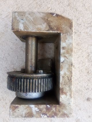Utillaje mecánico con engranaje – soporte de eje industrial Características: - Soporte con rodamientos donde gira un eje. - Un engranaje recto en el eje (rueda dentada) usado para transmitir movimiento. - Base pesada de fundición. Posibilidad de entrega en mano en Huesca.
