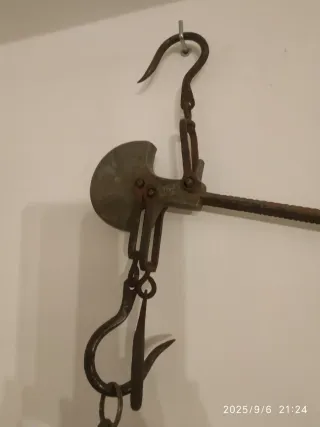 Balanza romana antigua de hierro, ideal para coleccionistas o decoración. - Material: Hierro fundido. - Diseño clásico de balanza. - Soporte para colgar.