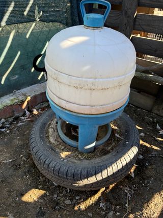 Bebedero para gallinas con gran capacidad. - Depósito blanco. - Base y asa azul. - Soporte de rueda. -sin patas