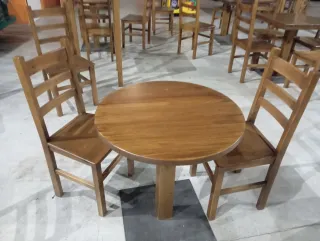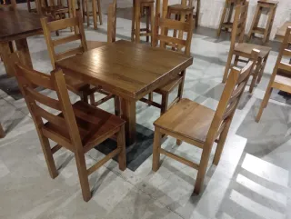 Conjunto de mesa y sillas de madera, ideal para bares o comedores. - Mesa cuadrada de madera. - Cuatro sillas de madera con respaldo. - Medidas 60x60