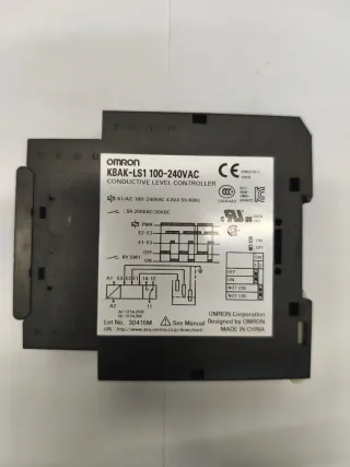 Relé de nivel conductivo Omron K8AK-LS. - Modelo: K8AK-LS - Marca: Omron - Tipo: Controlador de nivel conductivo - Terminales: E1, E2, E3, A1, A2 - Ajustes: Sense (10-100 kΩ), Delay (0.1-10 s) - Indicadores: PWR, RY - Temperatura mínima de cable: 75°C