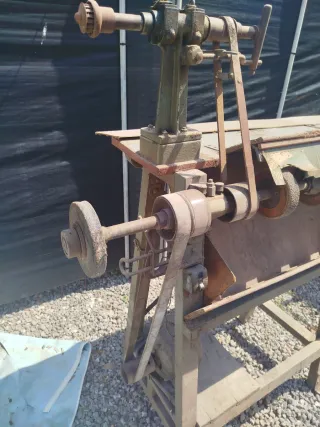 Máquina de zapatero antigua, ideal para coleccionistas o para proyectos de restauración. - Estructura metálica robusta. - Componentes visibles de transmisión por correa. - Diseño industrial clásico.