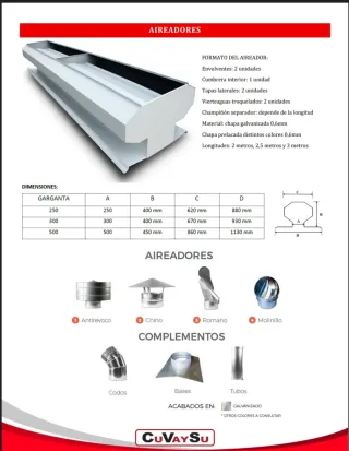 Sistema de aireadores para tejados, fabricados en chapa galvanizada y prelacada. - Formato envolvente. - Cumbrera interior. - Tapas laterales. - Vierteaguas troquelados. - Champiñón separador adaptable a la longitud. - Disponible en longitudes de 2, 2.5 y 3 metros. - Acabado galvanizado disponible.