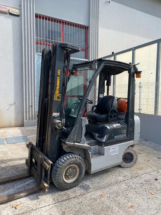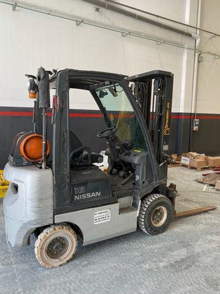 Carretilla elevadora frontal Nissan con capacidad de 1800 kg. Ideal para almacenes y logística. - Marca: Nissan - Modelo: 18 - Tipo: Carretilla frontal - Combustible: Gas (tanque naranja visible)