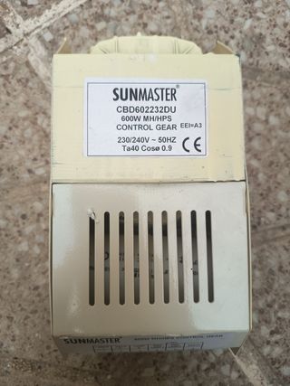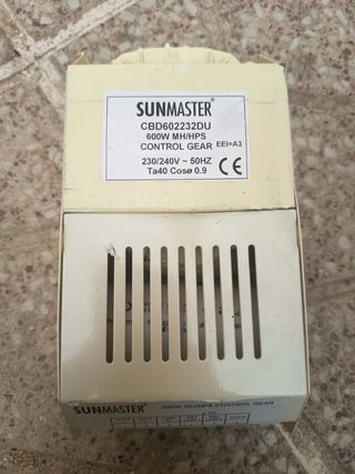 Se vende equipo de control Sunmaster para lámparas de 600W MH/HPS. Es de color beige claro y parece estar en buen estado. - Modelo: CBD602232DU - Potencia: 600W - Compatible con lámparas MH/HPS - Voltaje: 230/240V - Frecuencia: 50Hz