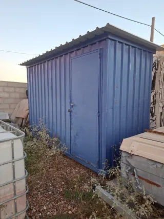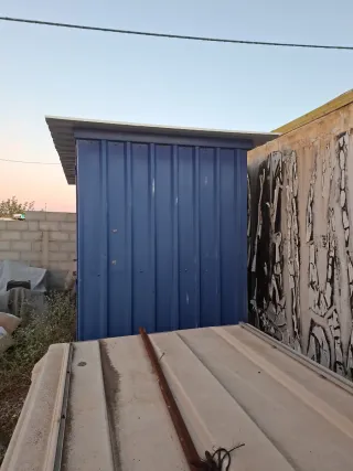Caseta de almacenamiento de metal con puerta. - Color azul. - Techo de chapa. - Estructura acanalada.