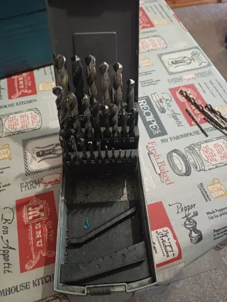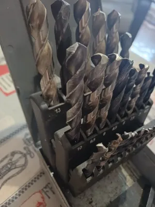 Brocas de 5mm,6mm ,dos unidades de 6,5mm,10mm y dos unidades de 12mm una de ellas usada pero funciona perfectamente. Si compras todo el lote regalo dos discos de corte marca wurth de 115mm.