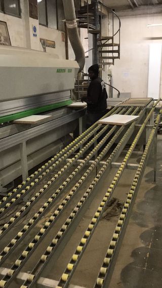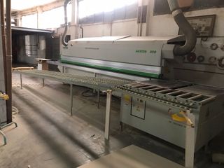 Aplacadora de cantos marca Artech modelo Arkon 800 con grupos de 2 tupís, grupo para refundir y grupo para matar cantos y rodillos de final de carrera.