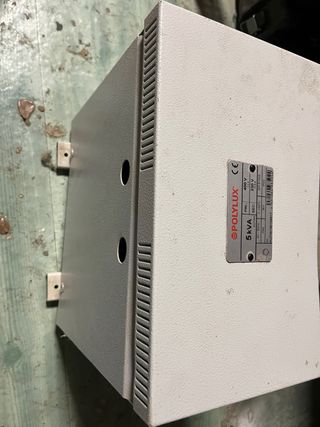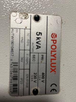 Transformador de la marca Polylux con una potencia de 5KVA. - Voltaje primario: 400 V. - Voltaje secundario: 230 V. - Frecuencia: 50-60 Hz. - Protección IP23. - Cumple con la norma EN 61558.