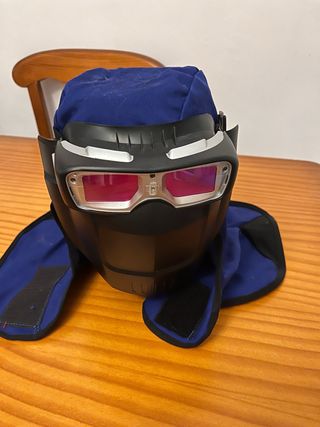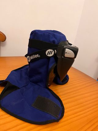 Pantalla de soldar de la marca Miller. Cubre cabeza y cubre cuello para mayor protección. - Color azul. - Correa ajustable. - Cierre de velcro