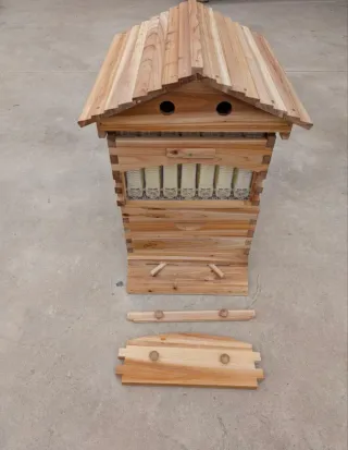 Colmena de madera para apicultura. - Estructura de madera. - Techo a dos aguas. - Dos orificios circulares en la parte superior. -Lleva 7 marcos para la miel y cajón de crias -lleva todos los accesorios para la miel la llave etc