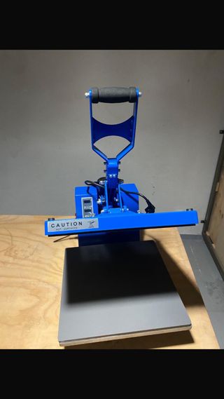 Plancha térmica de color azul, ideal para sublimación en textiles. Cuenta con un asa ergonómica para facilitar su uso. - Panel de control digital. - Superficie de calentamiento. - Indicador de CAUTION HOT SURFACES.