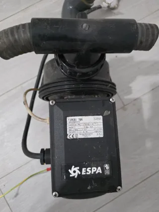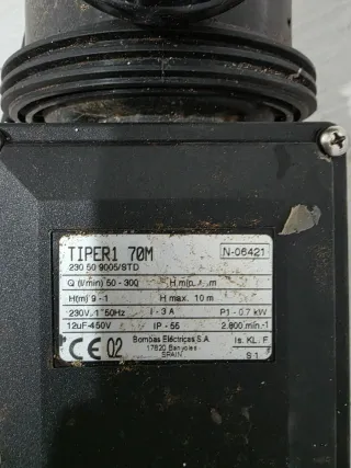 Bomba de agua ESPA modelo TIPER1 70M. Se puede ver y probar sin compromiso - Caudal: 50-300 L/min. - Altura máxima: 10 m. - Voltaje: 230V, 50Hz. - Potencia: 0.7 kW. - Velocidad: 2.800 min-1. - Condensador: 12uF-450V.