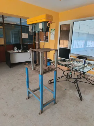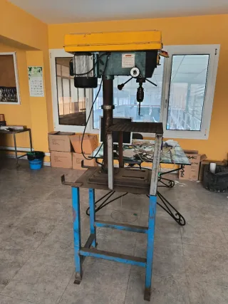 Taladro de pie industrial con motor. - Base metálica azul. - Columna de soporte. - Plato de trabajo. - Cabezal con motor y mandril.