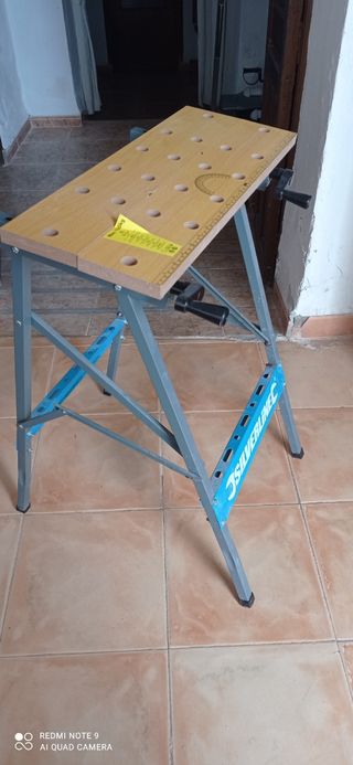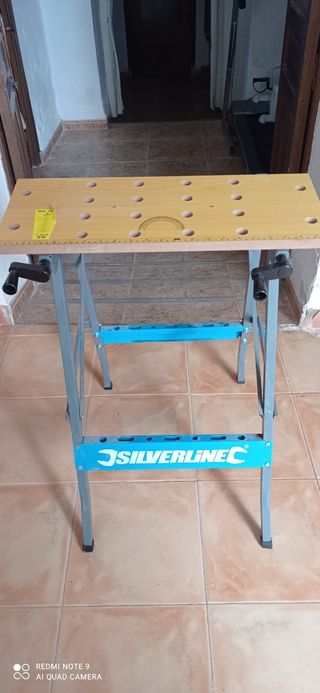 Banco de trabajo plegable de la marca Silverline, en buen estado. Es ligero y fácil de montar. - Perfecto para trabajos pequeños. - Superficie de madera. - Estructura metálica.