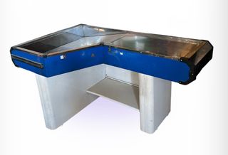 Mostrador de tienda con diseño en L, combinando colores azul y blanco. Cuenta con una superficie metálica y una balda interior. Largo - 1.70 metros Ancho - 1 metro Alto - 0.90 metro - Estructura en forma de L. - Superficie superior metálica. - Color azul en el frontal. - Base en color blanco. - Balda interior para almacenamiento.