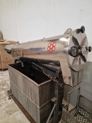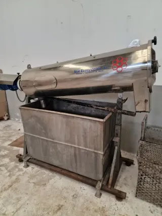 Equipo industrial de la marca Star Ecosystems, S.L., especializado en el tratamiento de aguas y lodos. - Fabricado en acero inoxidable. - Diseño cilíndrico con depósito. - Incluye cesta metálica. - Logotipo de la marca visible.