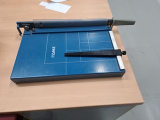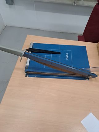 Cizalla de palanca profesional -longuitud de corte 360mm DIN A -Acero templado, rectificada -Cuchilla atornillada (se puede desmontar para afilar) -Sistema: Guillotina manual de palanca larga (muy buen brazo de fuerza) Protector frontal transparente de seguridad • Empujador / pisón de papel integrado Vale 450€