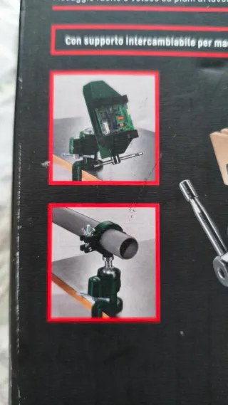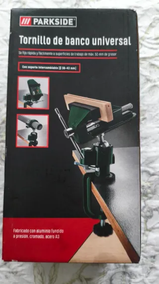 Tornillo de banco universal de la marca Parkside. - Se fija rápida y fácilmente a superficies de trabajo de máx. 50 mm de grosor. - Incluye soporte intercambiable (Ø 38-43 mm). - Fabricado con aluminio fundido a presión, cromado, acero A3.