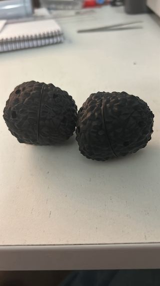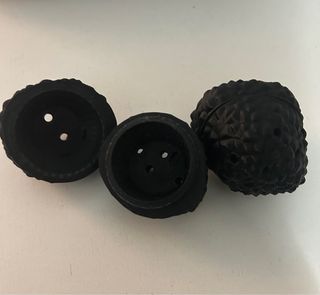 Juguete en forma de trufa para el adiestramiento de perros. Su diseño permite esconder premios en su interior. - Material: Plástico. - Color: Negro. - Textura rugosa.