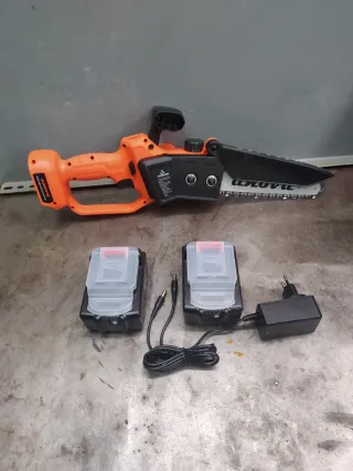 Sierra eléctrica inalámbrica de color naranja y negro, ideal para trabajos de jardinería o carpintería.,poda de arboles ,posibilidad de acoplar alargo telescopico. T 642516665 - Incluye dos baterías recargables. - Viene con cargador. - Diseño ergonómico para un mejor agarre.