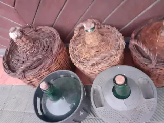 Conjunto de 6 botellones de vidrio, algunos con cestas protectoras de mimbre y otros con soportes de plástico. Ideales para el vino se vende el lote entero y se regala una bolsa llena de tapones de colcho - Botellones de vidrio de diferentes tamaños. - Cestas de mimbre para protección. - Soportes de plástico para botellones.