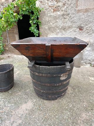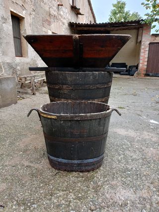 Conjunt antic i autèntic: un cubell i un brescat tradicional per trepitjar el raïm. Tenen més de 100 anys, però estan en perfectes condicions per continuar fent la verema o com a peça decorativa amb molt de valor històric. Totalment funcional: es poden utilitzar per trepitjar el raïm i recollir el most com es feia antigament. Material de roura i ben conservat. Història familiar: venim de masia i aquests estris han format part de les veremes de casa meva. Dimensions: (brescat 45 cm alçada, 122 cm ample i 122 cm de llarg). (Cubell 104x82cm diametre. Ideal tant per amants de la viticultura tradicional, decoració rústica, cellers.