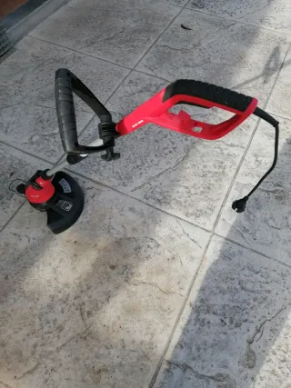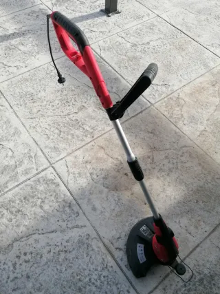 Desbrozadora eléctrica con mango ergonómico. - Mango principal de color rojo. - Mango secundario de color negro. - Eje metálico plateado. - Cabezal de corte en color negro y rojo.