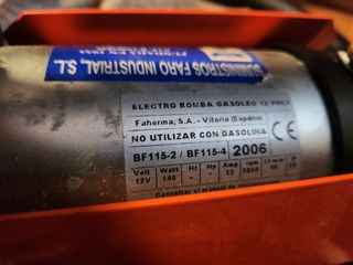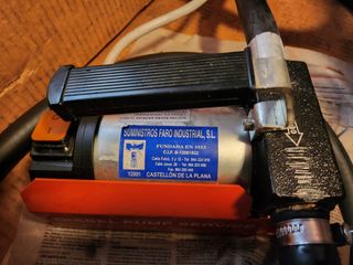 Electrobomba para gasóleo de 12V, Faherma SL. - Fabricación italiana - Voltaje: 12V - Watt 140 - Amp 22 - RPM 2.800 - Lt min 40 - IP 55 - Pistola automática - Conexión a batería o fuente de alimentación mediante pinzas (incluidas).