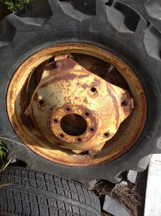 Ruedas de tractor en buen estado. - Neumático de goma resistente. - Llanta metálica con acabado en amarillo. - Múltiples tornillos de sujeción.