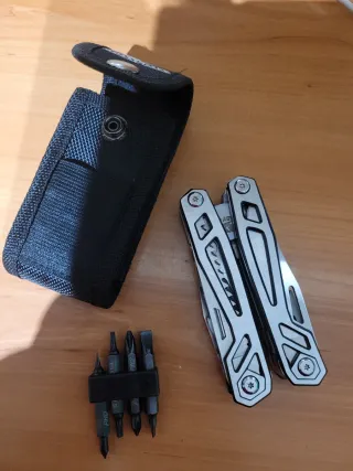 Alicate multiusos de acero inoxidable con funda de tela y juego de puntas. - Diseño compacto y ligero. - Incluye funda para cinturón. - Juego de 4 puntas de destornillador.