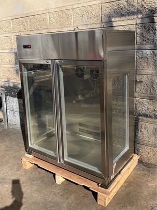 Expositor refrigerado para maduración de carne nuevo. Construido en acero inoxidable con puertas de cristal para visibilidad y cristales a los lados. Sin necesidad de conexion de agua con HR oscilante entre 65-75 siempre que se ponga sal. Posibilidad de ponerle visor de humedad relativa pero sin controlador del mismo. Mide 101 cm de largo por 60 de fondo y 130 de alto. Temperatura de trabajo de 0 a 3 grados. Llama al 6/4/0/7/6/2/6/4/7