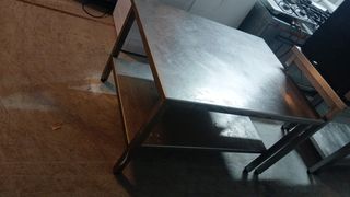 Mesa de trabajo robusta y duradera, ideal para cocinas o talleres. - Fabricada en acero inoxidable. - Diseño de dos niveles para mayor espacio. - Patas metálicas con protectores.