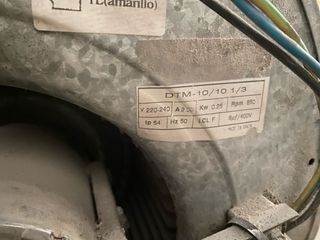 Caja de ventilación con turbina extractora DTM-10/10 1/3. - Voltaje: 220-240V - Amperaje: 2.90A - Potencia: 0.25Kw - RPM: 850 - Frecuencia: 50Hz - Clase de protección: IP 54 - Clase de aislamiento: I.CL F - Condensador: 9µf/400V - Fabricado en España.