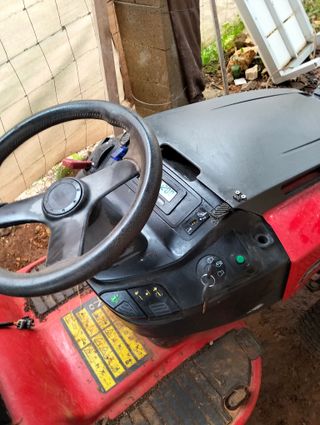 Tractor cortacésped con un diseño robusto, ideal para tareas de transporte de tierra o leña no tiene el cortador arranca ala primer 2 cilindro 4t precio 1.100 - Volante negro. - Panel de control con pantalla digital. - Llave de encendido. - Asiento rojo.