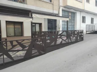 Terraza de bar con estructura metálica de 4 cuerpos dos cuerpos con toldos y decoración en laterales y otros dos cuerpos más largos y más normales también ,precio a negociar se puede vender también con 20 juegos de mesas y sillas - Diseño moderno y geométrico. - Ideal para exteriores.