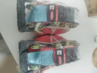 Juego de dos cinchas de sujeción de la marca Ratio. - Longitud: 0.5 m - Ancho: 50 mm - Carga de rotura: 4000 daN - Carga de trabajo: LC 2000 daN - Elongación: <7% - Fecha de fabricación: 06/2024
