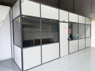Módulo de oficina prefabricado, ideal para crear un espacio de trabajo independiente. - Paneles de color blanco y gris. - Ventanas de cristal. - Puerta de acceso.