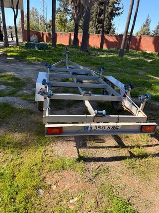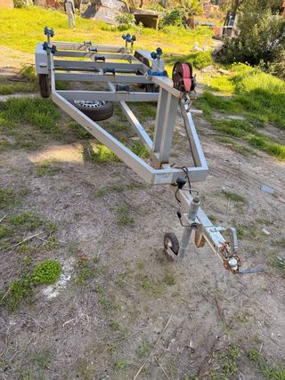 Alquiler de Remolque por dias , diseñado para el transporte de embarcaciones de hasta 6 metros de eslora. Estructura robusta y funcional de dos ejes - Fabricado en metal resistente. - Equipado con rodillos para facilitar la carga y descarga. - Luces traseras de señalización y documentado. Fianza y cinchas de amarres aparte.