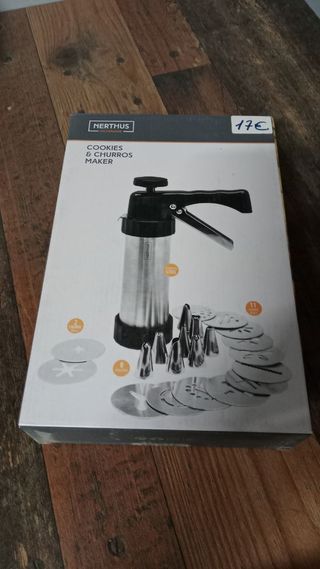 Pistola NERTHUS FIH 1370 para hacer churros caseros fácilmente. Incluye varias boquillas con diferentes formas y acabados para churros de distintos estilos.
