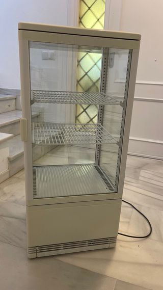 Vitrina refrigerada de sobremesa con puerta de cristal. • Capacidad: 78 litros • Temperatura: 0–12 °C • Estantes regulables • Puerta de cristal • Ideal para bebidas, postres o pastelería Funciona perfectamente. Se vende por cambio de uso.