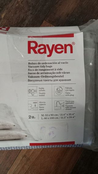 Pack de 2 bolsas de almacenamiento al vacío de Rayen, diseñadas para guardar ropa, mantas, edredones u otros textiles ahorrando espacio. Transparente para ver el contenido fácilmente. Marca: Rayen Tipo: bolsas de vacío para ropa Cantidad: 2 unidades Tamaños: 55 × 90 cm y 80 × 100 cm Material: plástico transparente resistente Uso: almacenamiento, viaje, protección contra polvo y humedad Reutilizable y fácil de sellar