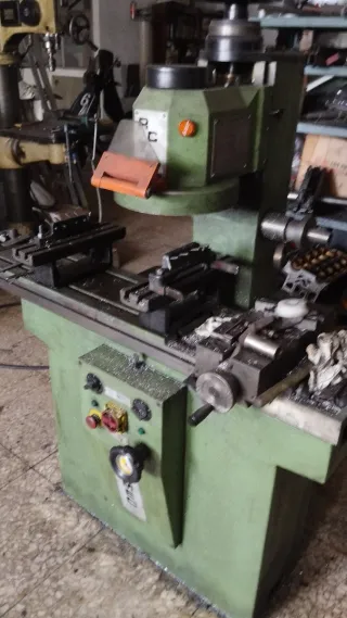 Máquina rectificadora de culatas para taller. - Color verde. - Panel de control con botones y selector. - Superficie de trabajo con guías.