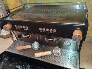 Cafetera industrial de doble grupo, ideal para negocios de hostelería. - Diseño profesional en color negro. - Incluye dos portafiltros con asas de madera. - Panel de control con botones para diferentes tipos de café y vapor.