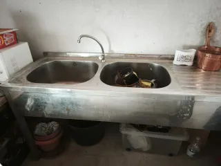 Fregadero de acero inoxidable de gran tamaño, ideal para cocinas profesionales o para quienes necesitan un espacio de lavado amplio. - Medidas 170 x 90 x 60 cm de fondo. - Fabricado en acero inoxidable. - Doble seno. - Grifo incluido. - Falta la bandeja inferior.