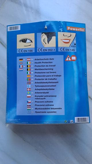 Set de protección ocular y auditiva Powerfix. - Gafas de seguridad transparentes. - Protectores auditivos naranjas y negros. - Mascarilla de protección.